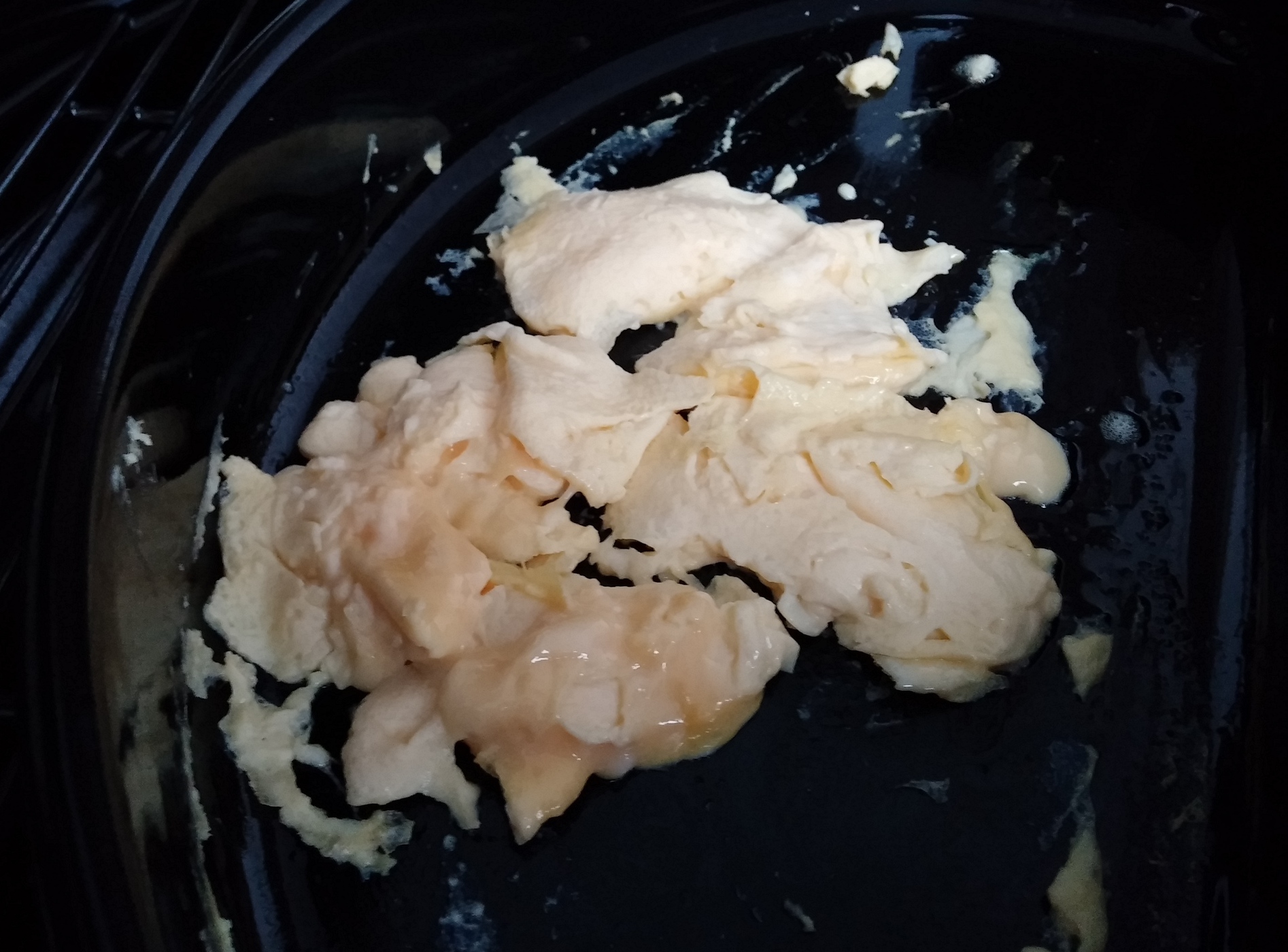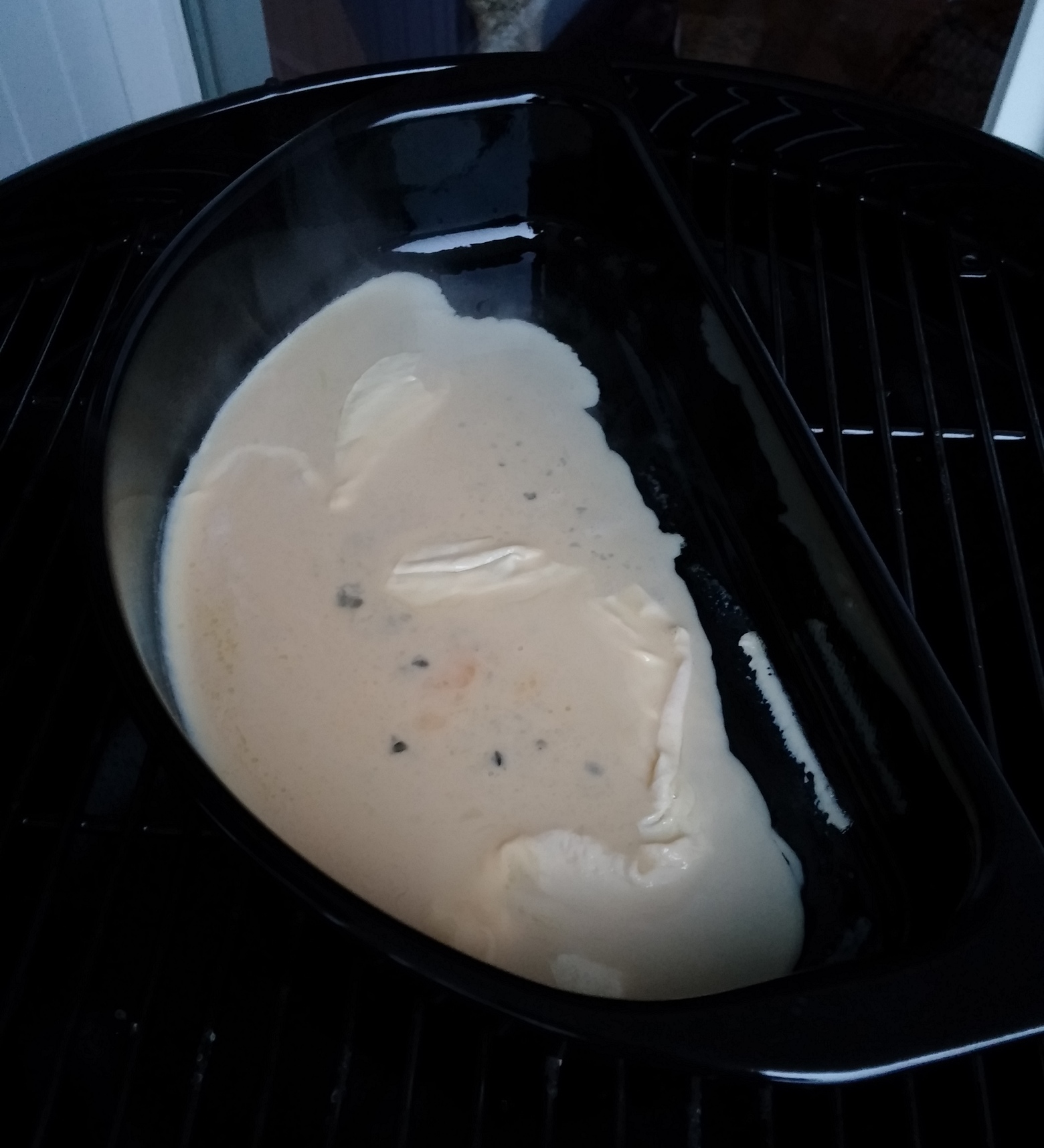 Was also tun? Da hilft nur eins – es muss zum Frühstück gegrillt werden. Und zu einem Frühstück passt Rührei sehr gut. Schnell habe ich also zwei Eier aufgeschlagen und mit etwas Milch angerührt. Das Ei kam dann in den zuvor mit Pam (das ist eine tolle Erfindung: Öl zum Sprühen, das habe ich erstmalig in Kanada bei Gary und Jodie kennengelernt und mich prächtig darüber amüsiert) eingesprühten Gourmet-Halbmond. Durch das indirekte Grillen wurde das Rührei mehr gebacken als von unten (wie in der klassischen Pfanne) erhitzt. Das führte dazu, dass das Rührei sehr luftig, saftig und lecker wurde. So ein gutes Rührei hatten wir schon lange nicht mehr. Die Brötchen, die ihr auf den Fotos sehen könnt, waren vom Vortag und wurden nur fix mit aufgebacken 🙂