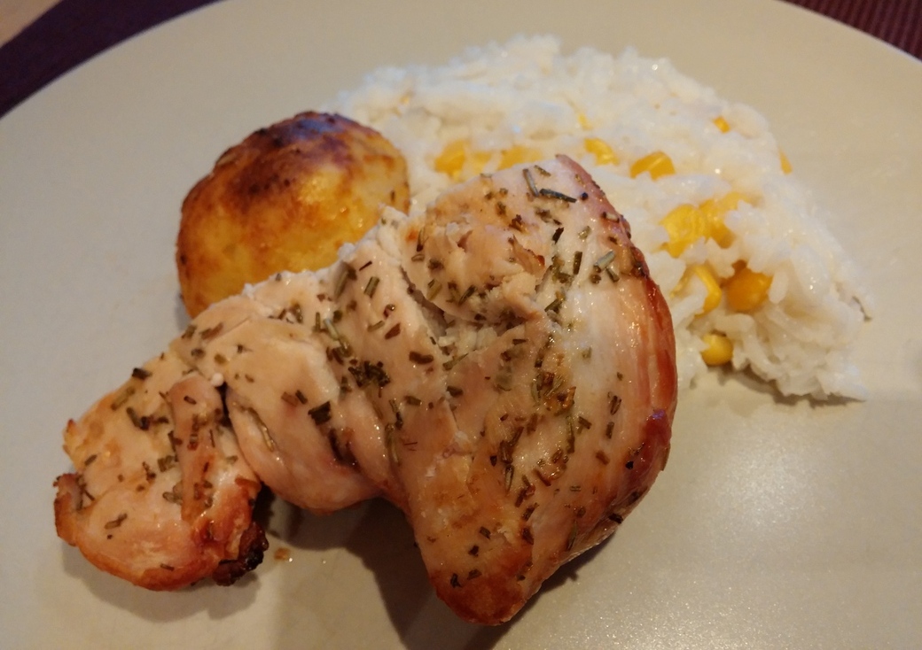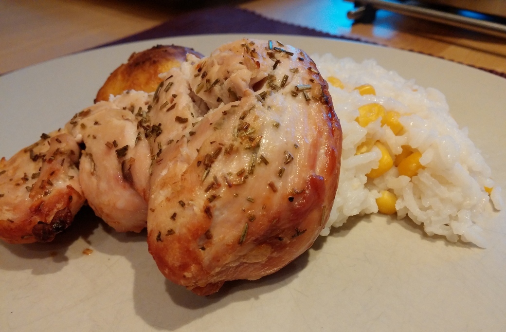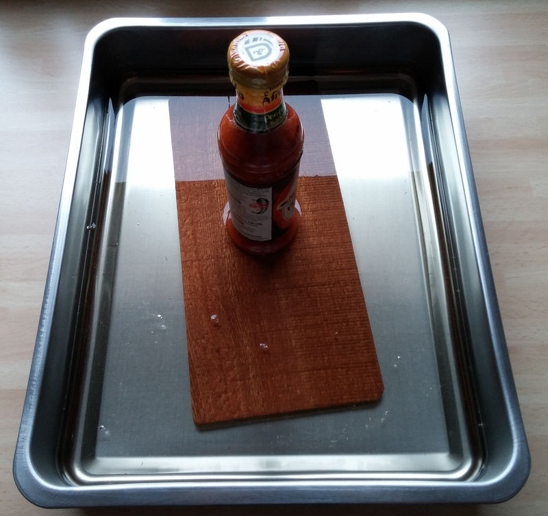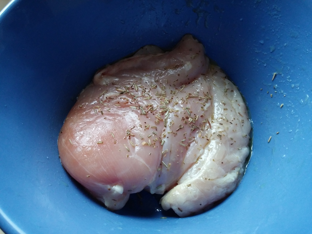 Zunächst das Hähnchenfleisch waschen und abtupfen. Mit etwas Olivenöl, Zitrone, Rosmarin und Salz marinieren und abgedeckt im Kühlschrank mindestens 2 Stunden lang ruhen lassen. Die Grillplanke muss vor dem Grillen gewässert werden, damit sie nicht sofort auf dem Grill verbrennt. Laut Outdoorchef muss sie das sogar über Nacht tun, was ich ziemlich unpraktisch finde. Außerdem soll sie ja ein wenig kokeln, von daher habe ich die Planke nur 2 Stunden in Wasser eingeweicht.