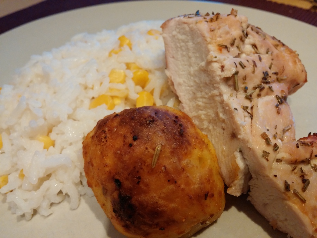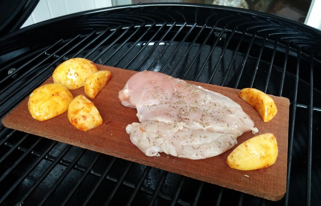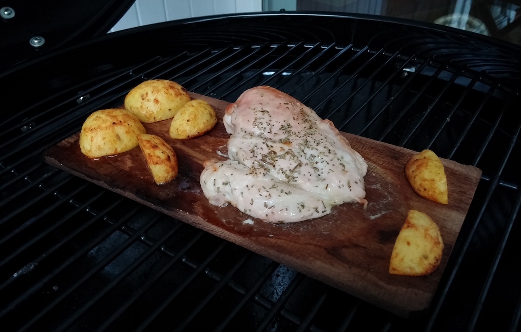 Da ich leider den Fehler gemacht hatte, die Zedernholzplanke sofort mit dem Grillgut aufzulegen, musste ich mit größerer Hitze arbeiten als geplant, damit die Planke ausreichend anfängt zu trocknen und Aromen abzugeben. Leider wurde dadurch das Hähnchenfleisch etwas trocken. Beim nächsten Mal weiß ich es besser. Neben dem Hähnchenfleisch habe ich auch noch einige Kartoffelecken mit auf die Planke gelegt, die ich zuvor mit Olivenöl, Salz und Magic Dust gewürzt hatte, um zu probieren, wie das so gelingt und schmeckt.
