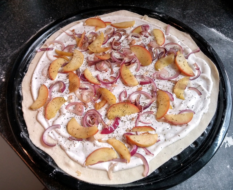 Also: Teigling auf das gefettete Pizzablech legen und mit Ziegenkäse-Creme bestreichen. Dabei lasse ich circa 1 – 1,5 cm Rand frei. Auf den Ziegenkäse streue ich die angebratenen roten Zwiebeln sowie die Apfelscheibchen. Zum Schluss mit frisch gemahlenem Pfeffer sowie Rosmarin und Thymian bestreuen – fertig (siehe Bildergalerie)!