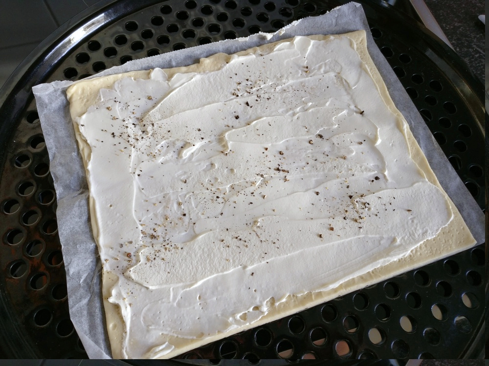Den Teig bestreiche ich mit Schmand und würze ihn mit Pfeffer (hier nehme ich wieder die geliebte 9-Pfeffer-Symphonie von Ankerkraut). Auf den Schmand kommen dann die in Streifen geschnittenen Aprikosen aus der Dose sowie die Schinkenwürfel.