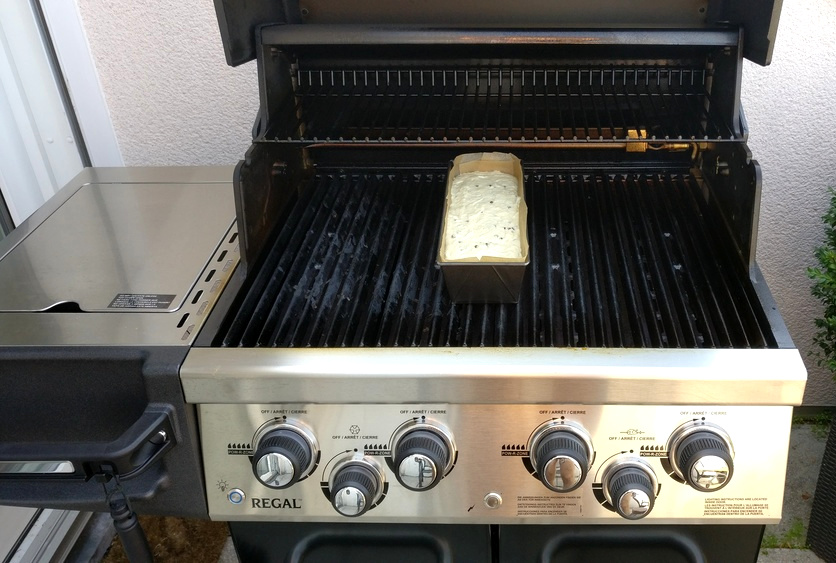 Den Broil King heize ich zum Backen zunächst auf zwei Drittel Leistung mit allen vier Brennern auf. Wenn sich das Deckelthermometer der 300 Grad Marke nähert, kommt das Bananenbrot in der Kastenform in die Mitte auf das Grillrost. Zum indirekten Grillen schalte ich die beiden inneren Brenner aus, sodass lediglich die äußeren Brenner für die indirekte Hitze sorgen.