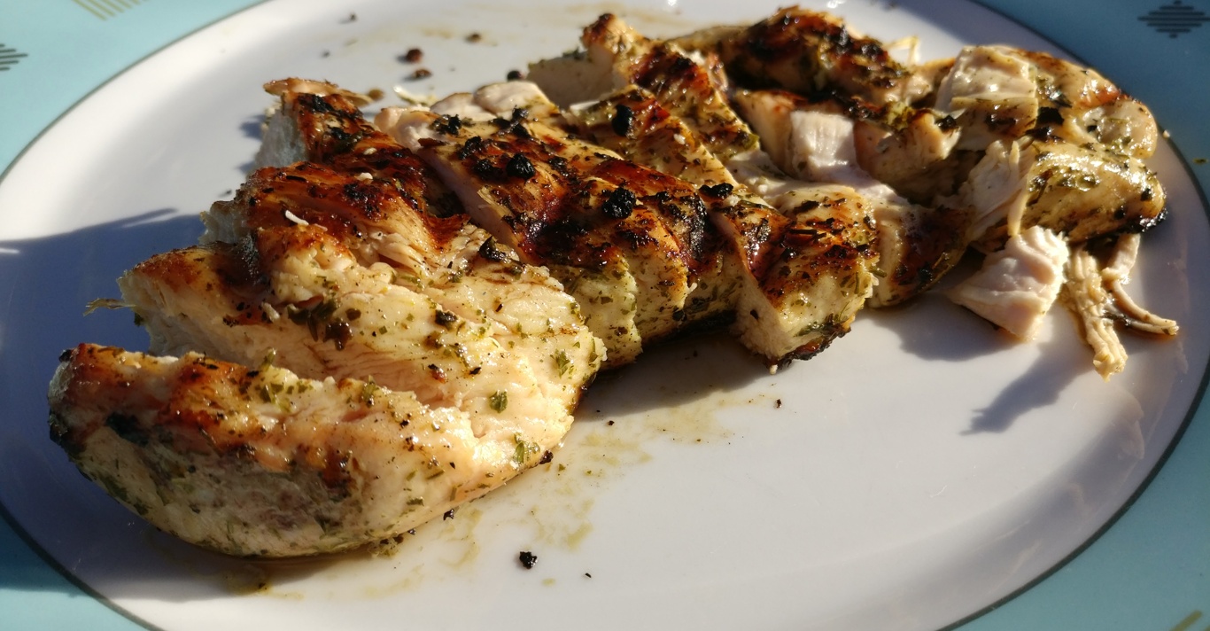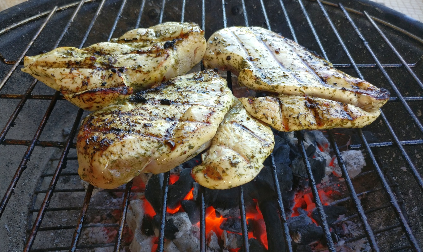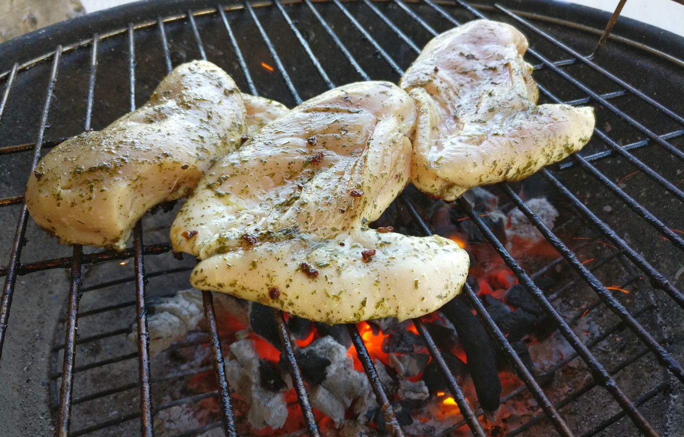 Dazu lege ich die marinierten Hähnchenbrustfilets auf den heißen Grillrost und grille sie von beiden Seiten für jeweils maximal 10 Minuten an.