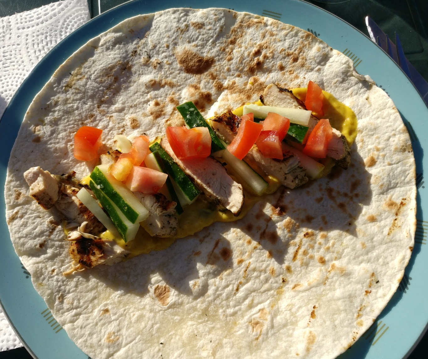 Das Belegen und Rollen der Wraps erfolgt nach folgender Reihenfolge: Erst kommt die Currysauce, dann Fleisch und dann das Gemüse sowie Ananas. Zum Schluss rolle ich den Wrap auf, dann kann das Schlemmen beginnen.