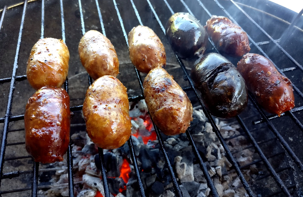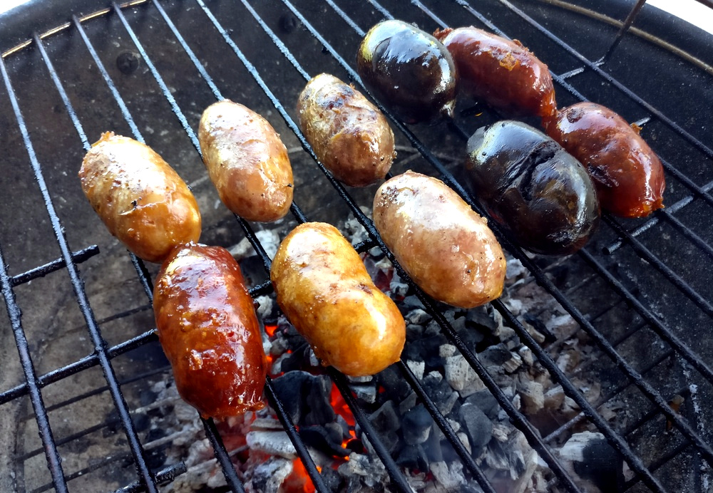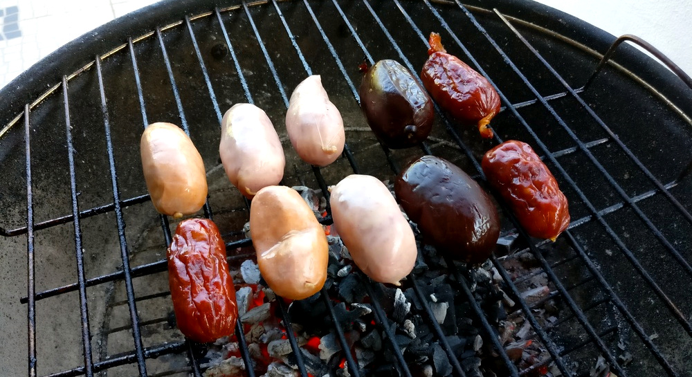 Die Kohle glüht ein letztes Mal, und die gemischte portugiesische Wurstpackung „Churrasco Misto“ kommt auf den heißen Grillrost. Von nun an gilt es, regelmäßig die Wurst zu wenden. Aufgrund des hohen Fettgehaltes piekse ich die Würste an, damit das heiß und flüssig gewordene Fett abtropfen kann.