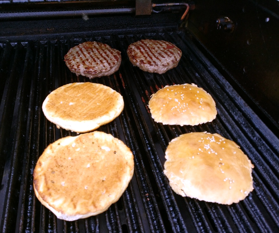 Ich grille die Patties für circa vier Minuten bei 1/3 Leistung von jeder Seite an, damit sie saftig bleiben und von innen medium sind. Sobald die Patties gedreht wurden, kommen daher auch die Buns auf den Warmhalterost und dürfen dort sich aufwärmen, bevor sie noch eine Minute geröstet werden.