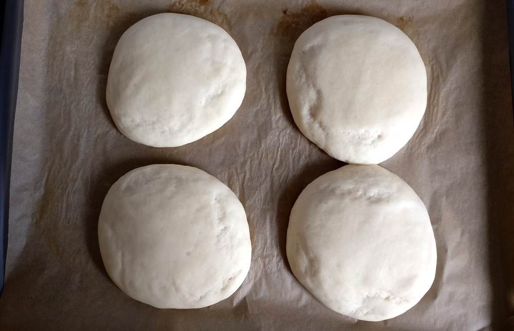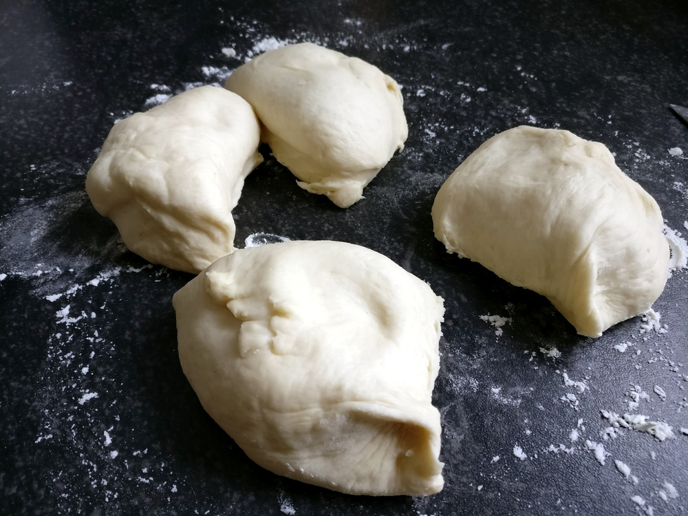 Jetzt heißt es: Buns rollen! Auf der bemehlten Arbeitsfläche viertele ich meinen Teig und rolle mit der flachen Hand vier schöne Buns, die ich auf das Backblech (mit Backpapier) lege. Die Teiglinge müssen nun weitere 30 Minuten an einem warmen Ort gehen.
