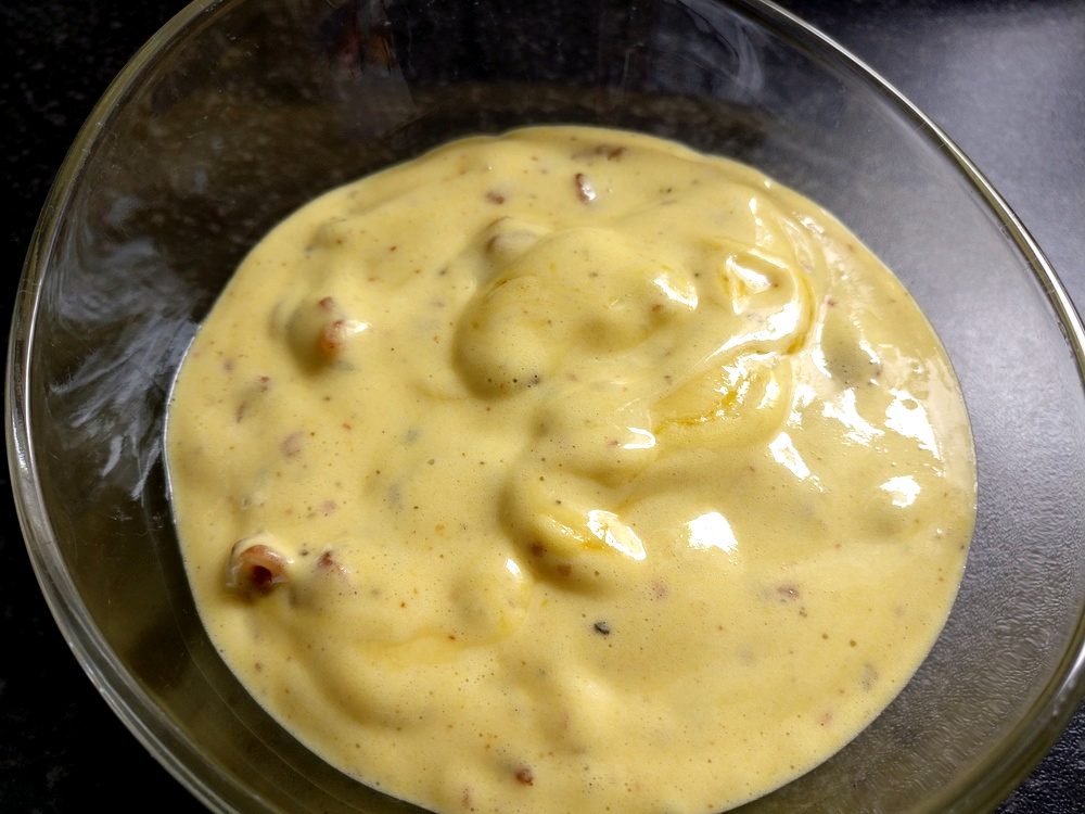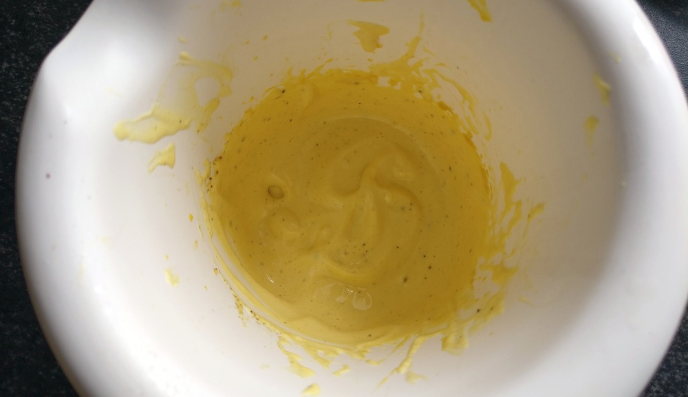 Das Eigelb, zwei Teelöffel Senf und etwas Apfelessig rühre ich mit dem Mixer durch. Nun kommt der schwierige Teil beim Mayonnaise machen: das Hinzufügen des Öls. Macht man es zu schnell, bekommt man keine Mayo-Creme, macht man es zu langsam… nun ja – steht man ewig zu rühren 🙂 Also gebe ich (gefühlt Esslöffel-weise) Sonnenblumenöl zu Eigelb-Senf-Mischung, und es dickt unter ständigem Mixen langsam an.