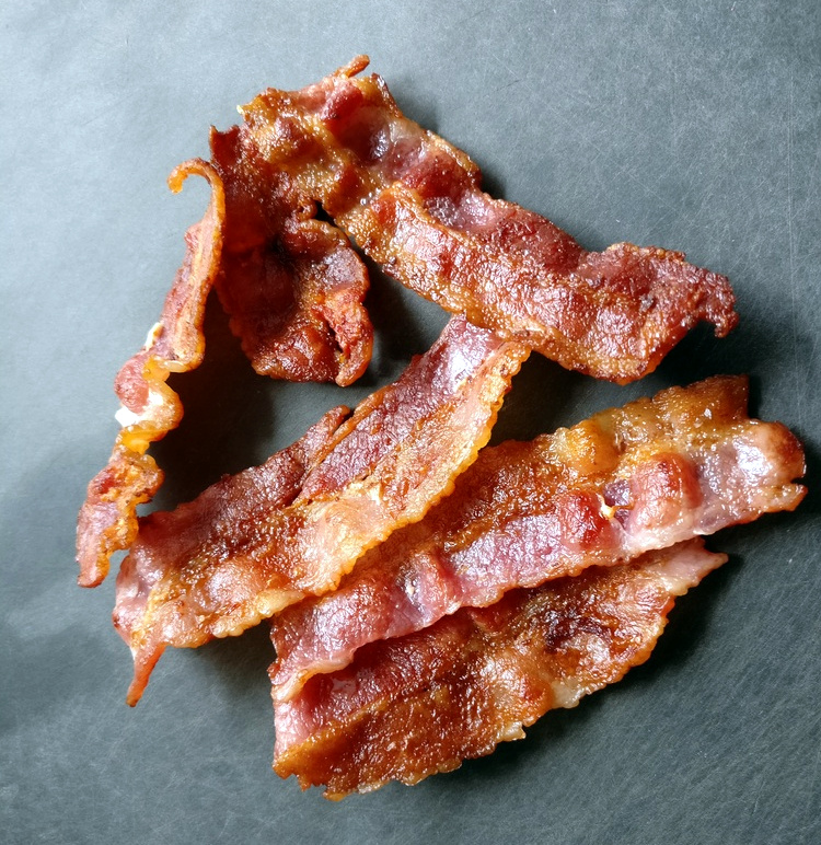 Die Buns für den Classic Burger liegen bereit, aber es fehlt die Baconnaise, damit es ein richtiger „Classic Burger mit Baconnaise“ wird! Also kommen zwei Eigelb in den Rührbecher, während in der Pfanne der Bacon (ohne zusätzliches Fett) kross gebraten wird.