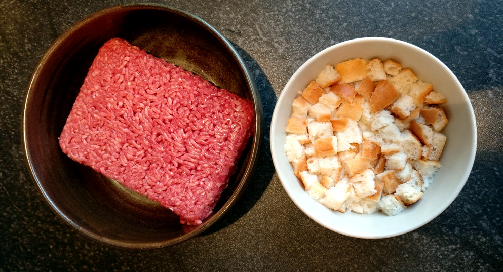 Beim Burger-Patty experimentiere ich dieses Mal etwas und schneide dazu das normale Brötchen in kleine Würfel, und weiche es in lauwarmer Milch ein. Die eingeweichten Würfel drücke ich ca. 20 Minuten später aus und vermenge sie mit dem Hackfleisch, einem Ei und etwas Salz. Nun ist die Masse für die Pattys fertig und mit meiner Burger-Presse forme ich die Pattys aus.