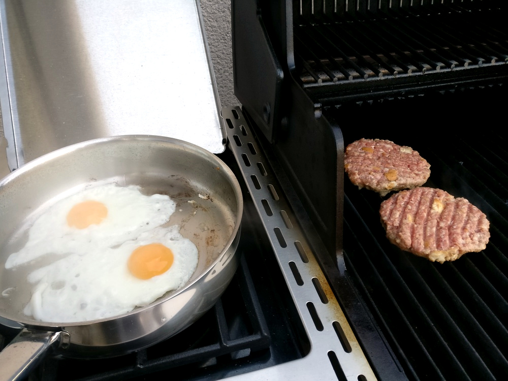 Parallel nutze ich wieder den Seitenbrenner meines Broil King, um die Spiegeleier für den Country Burger vorzubereiten. Ich habe euch die einzelnen Schritte in einer kleinen Galerie zusammengefasst: