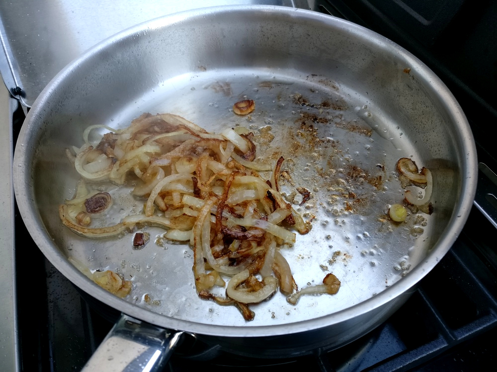 Zunächst bereite ich auf dem Seitenbrenner in einer Edelstahlpfanne die karamellisierten Zwiebeln zu. Die grob geschnittene Zwiebel schwitze ich dazu in etwas Sonnenblumenöl an. Sobald die Zwiebeln glasig sind, gebe ich 1 – 2 EL braunen Rohrohrzucker hinzu und lasse die Zwiebeln auf kleinster Stufe fünf Minuten karamellisieren.