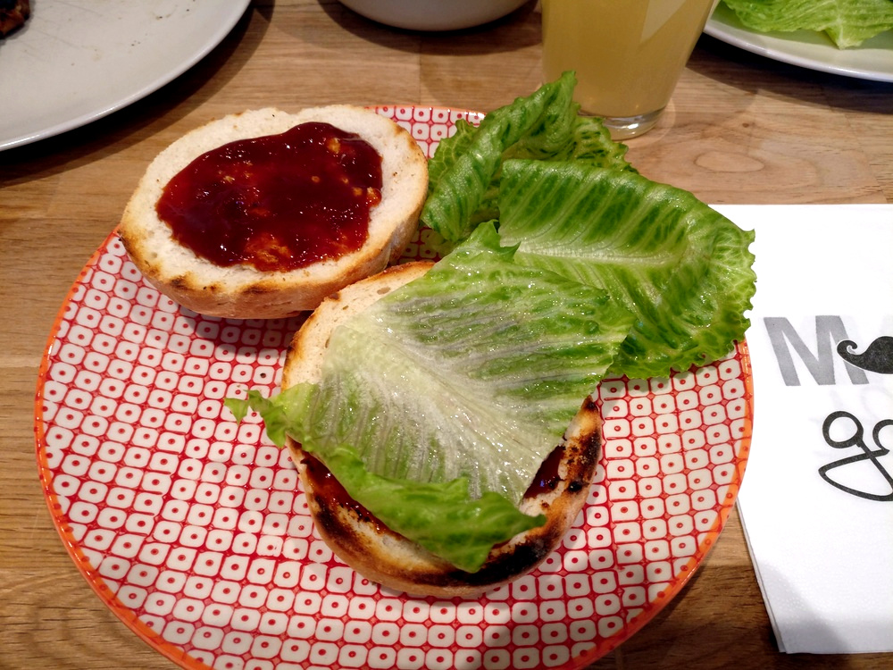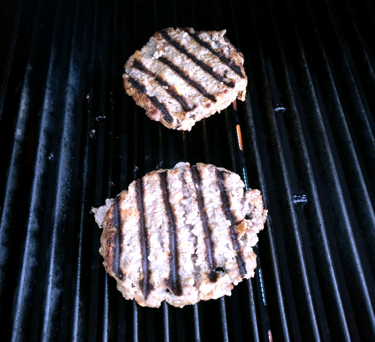 (2) Für die Pattys hatte ich dieses Mal Bio-Hackfleisch beim Discounter gekauft. Der Wasseranteil war jedoch ziemlich hoch, worunter nicht nur der Geschmack gelitten hat. Beim Grillen ist viel Flüssigkeit ausgetreten und die Pattys haben dadurch ihre Form nicht wirklich behalten. Um die gesamte Packung zu verarbeiten, habe ich vier Pattys zubereitet und nur einer ist wirklich heil vom Grill gekommen. Beim nächsten Mal kaufen wir doch lieber wieder das Gehackte beim Metzger.
