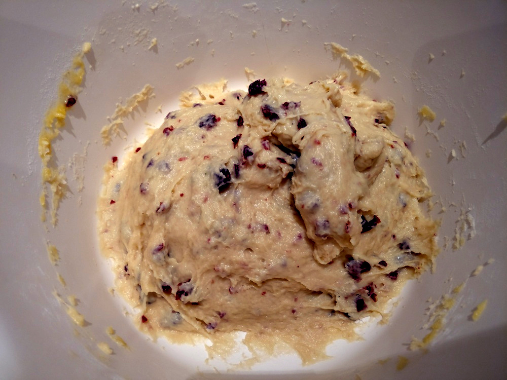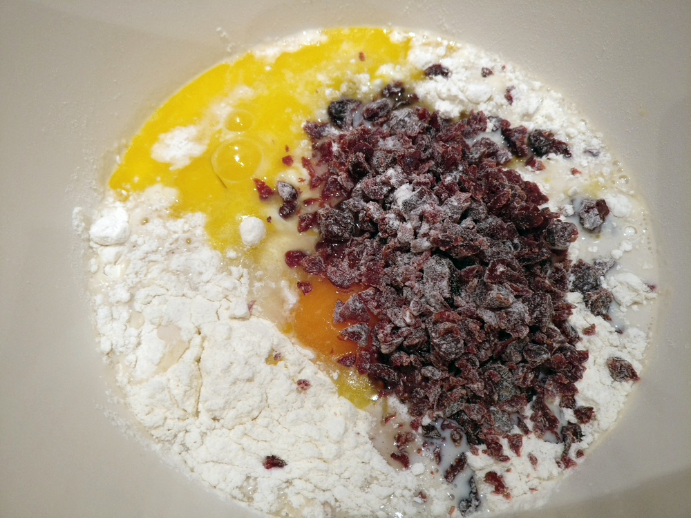 Sobald ich mit den Cranberries fertig geworden bin, schmelze ich die Halbfettmargarine in der Mikrowelle und verknete dann die zerlassene Margarine mit der Mehl-Zucker-Mischung, der Hefe-Milch-Mischung und einem Ei. Zuletzt knete ich noch die Cranberries unter.