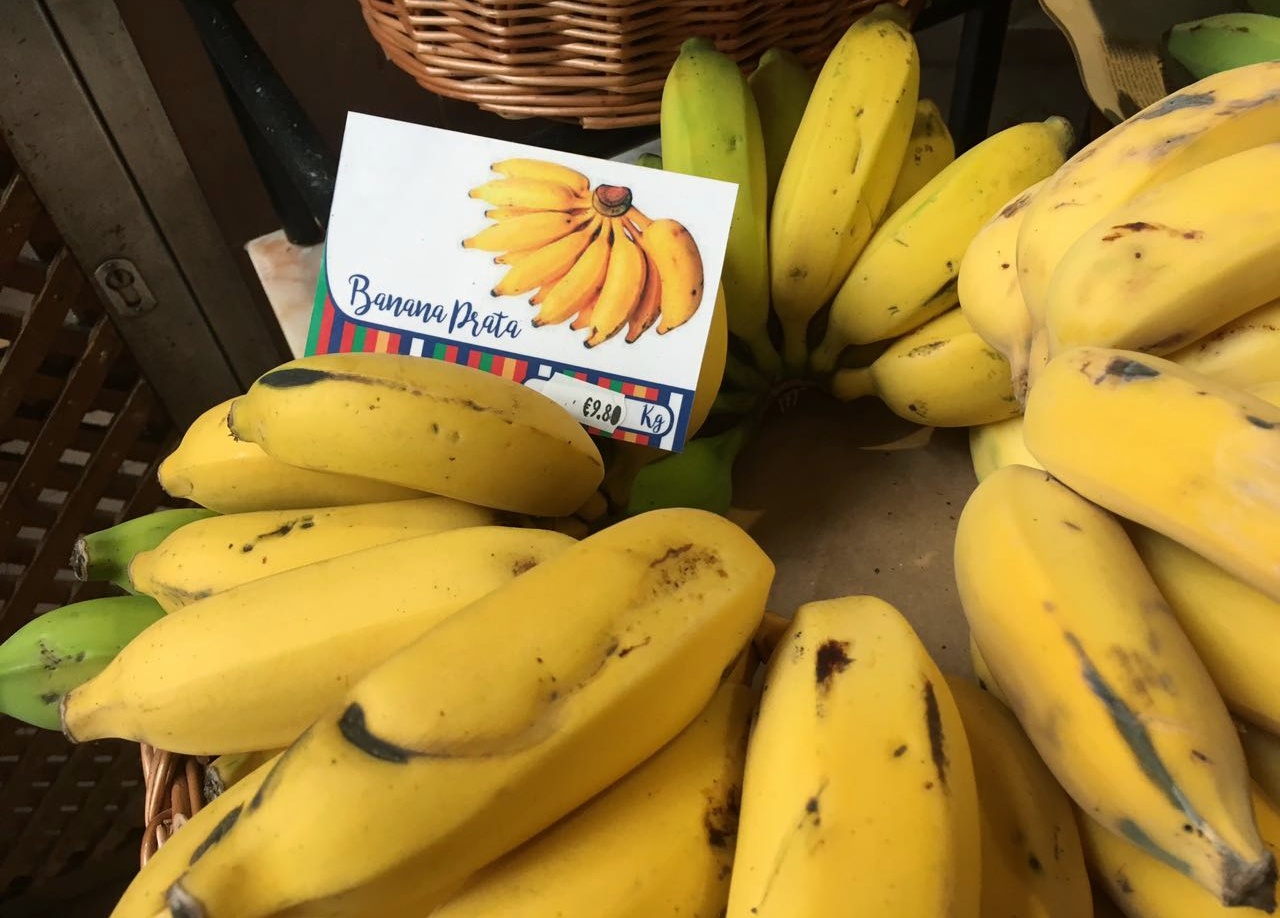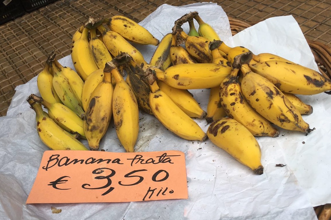 Ich hatte im Vorfeld schon gelesen, dass die Preise im Mercado dos Lavradores teilweise extrem überzogen sein sollten, vor allem im Obergeschoss, wohin nur wenige Einheimische gehen. Allein bei den Bananen war ein krasses Gefälle bei den Preisen zu beobachten. Der Kilopreis reichte von 0,75 Euro bis 9,80 Euro. Ich habe gelernt, dass man dabei Bananen nicht mit Prata Bananen vergleichen darf. Prata Bananen sind geschmacklich deutlich intensiver, haben weniger Kalorien und sollen leichter verdaulich und haltbarer sein. Doch die Preisspanne mit 3,50€ pro Kilo zu 9,80€ war für Prata Bananen überraschend groß, und auch normale Bananen hatten sehr unterschiedliche Preise.