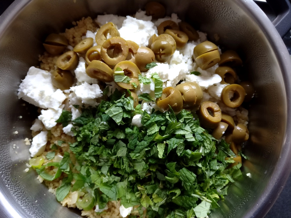 Während das Gemüse glasig dünstet, schneide ich die Oliven in Ringe und hacke die Minze fein. Wenn das Gemüse angeschwitzt und der Couscous fertig gequollen ist, vermenge ich das Gemüse, die Oliven und die Minze miteinander. Zusätzlich zerbrösel ich 100 g Feta in die Couscous-Mischung und schmecke alles mit Salz, Pfeffer, Cayenne-Pfeffer und Zimt ab.
