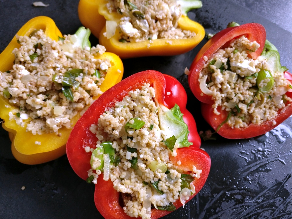 2 Paprika-Schoten 100 g Vollkorn-Couscous (von Reishunger) 3 Frühlingszwiebeln 3 kleine Knoblauchzehen 40 g grüne Oliven, entsteint 100 g Feta Salz Pfeffer Cayenne-Pfeffer Zimt 1 TL Gemüsebrühe