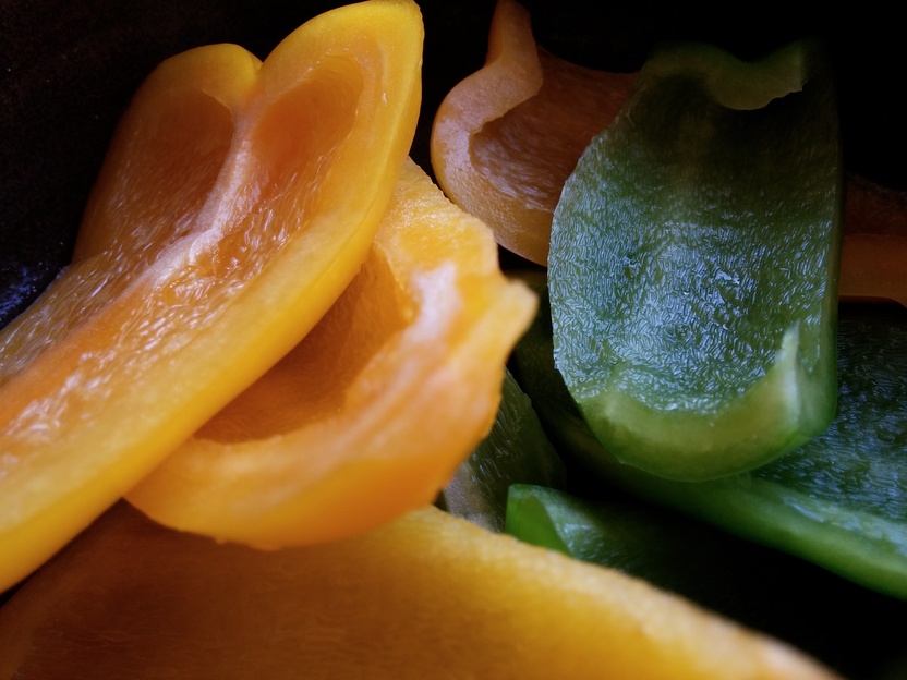 2 Paprika 2 Zwiebeln 2 Maiskolben 6 Datteln 3 Scheiben Frühstücksspeck Sesamkörner 4-5 mittelgroße Kartoffeln Rapsöl griechische Gewürzmischung Salz
