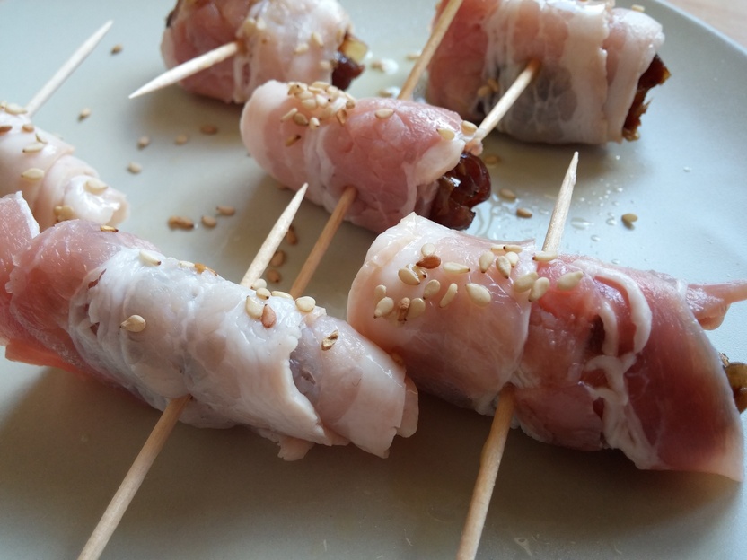 Nun kann ich mich um die Paprika kümmern, die ich entkerne, reinige und in Viertel schneide. Die Paprikaviertel mariniere ich genauso wie die Kartoffeln und die Zwiebeln. Die Datteln sind bereits entkernt, sodass ich sie nur noch von innen mit Sesamkernen füllen und mit Speck einwickeln muss. Zur Fixierung verwende ich gewässerte Zahnstocher.