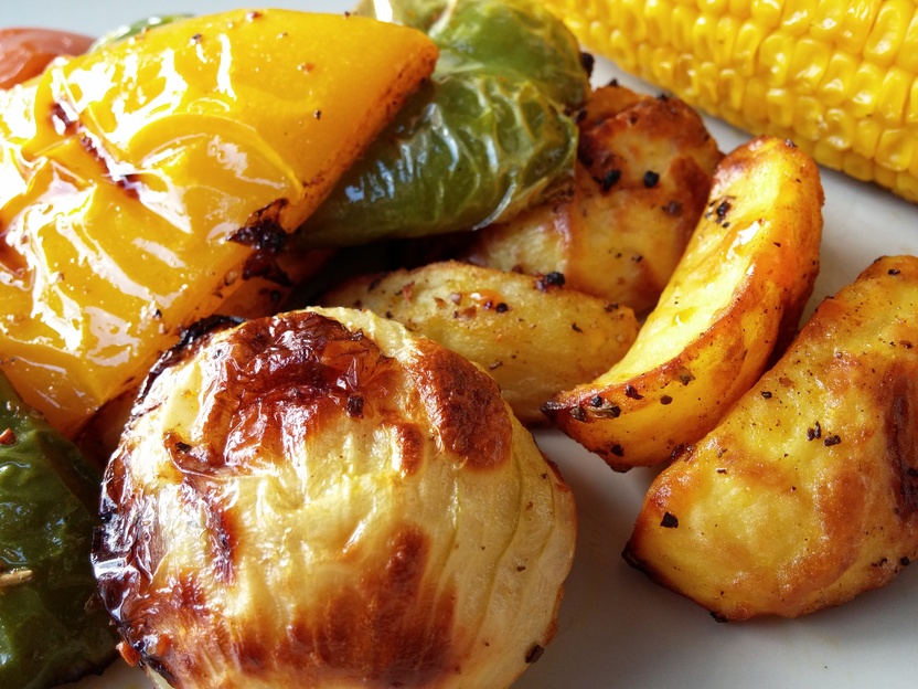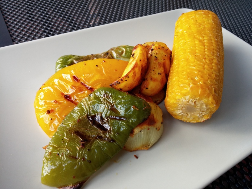 Die Kartoffeln brauchen insgesamt 35-40 Minuten bei mittlerer Hitze auf dem Grill, für die letzten 20 Minuten kommen die Maiskolben mit auf den Grillrost und für die letzten 15 Minuten die Paprika sowie die Datteln.