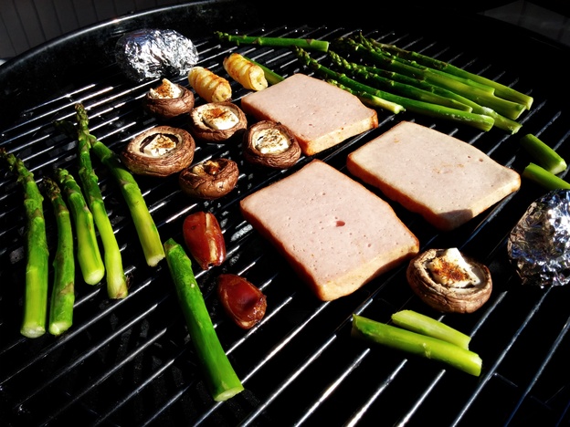 Perfektes Wetter zum Pfingstwochenende. Das heißt für mich, es wird gegrillt. Heute soll es eine Gemüsevariation aus grünem Spargel und gefüllten braunen Champignons an Leberkäse mit gefüllten Kartoffeln geben. Hier die Zutaten im Überblick: