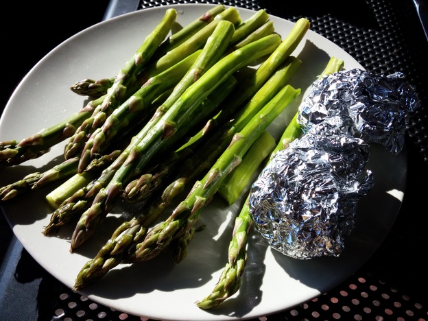 Die Kartoffelspiralen und die beiden Kartoffeln in Alufolie kommen nun auf den vorgeheizten Grill bei circa 200 Grad. Erfahrungsgemäß brauchen sie zum Garen um die 40 Minuten.