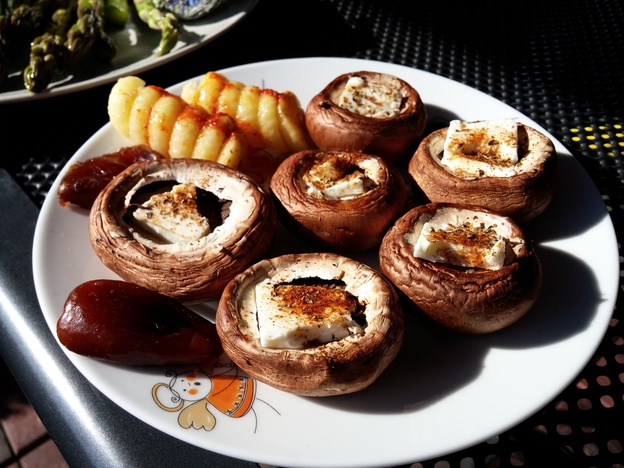 Nun kümmere ich mich um die Champignons, die ich zuerst abbürste. Pilze sollte man auf gar keinen Fall mit Wasser abspülen, denn dann würden sie sich nur mit Wasser vollsaugen und an Geschmack verlieren. Außerdem besitzen sie auch so genug Flüssigkeit. Ich entferne dann die Stiele der gereinigten Pilze, um Platz für die Füllung aus zerbröseltem Feta-Käse zu schaffen. Zum Schluss kommt noch etwas griechische Gewürzmischung darüber und fertig.