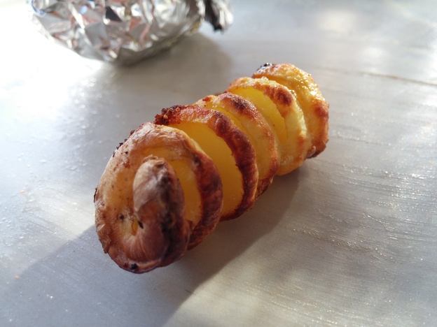 Nachdem ich den Grill zum Vorheizen auf mittlerer Hitze angemacht habe, fange ich auch heute wieder mit den Kartoffeln an. Aus unserem Mallorca-Urlaub haben wir einen Kartoffelspiralschneider mitgebracht, mit dem man Spiralen aus Kartoffeln ausschneiden kann. Wir nutzen heute dieses Werkzeug, um die Kartoffeln auszuhöhlen. Die hohlen Kartoffeln fülle ich mit kleingeschnittener getrockneter Tomate und etwas geriebenem Gouda. Die Kartoffeln werden dann von außen mit etwas Margarine eingerieben und in Alufolie eingewickelt. Die übrig gebliebenen Kartoffelspiralen schmeiße ich natürlich nicht weg, diese werden mit etwas Magic Dust und Olivenöl mariniert und mit gegrillt!