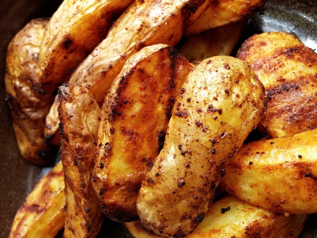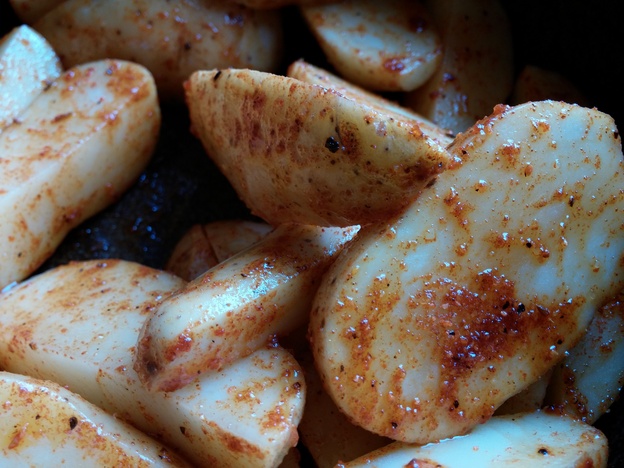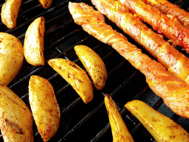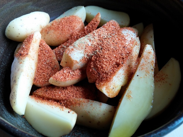 Die Kartoffeln habe ich nur abgewaschen und abgetrocknet, denn sie hatten eine schöne Schale, die man nicht entfernen brauchte. Mit etwas Olivenöl, Magic Dust und Kreuzkümmel würzen, schon konnten sie für 35 Minuten auf den vorgeheizten Grill bei 200 Grad.