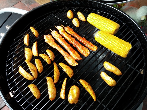 Nach zehn Minuten folgten die Maiskolben und nach weiteren fünf Minuten die Grillfackeln. Und nach 35-40 Minuten wurde es auch Zeit für das Essen, ich war wirklich hungrig! Wie fast immer war es sehr lecker: Bei den Kartoffeln ist die Schale durch das langsame Aufbacken bei 200 Grad schön aufgegangen und schmeckte schön kross, aber ohne das der Paprika im Magic Dust Gewürz verbrannt ist. Sehr lecker, dazu der Mais und die Grillfackeln …. mmmmh!