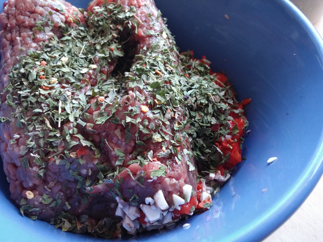 500 g gutes Rindergehacktes 50 g Champignons 4 EL eingelegte Paprikastreifen aus dem Glas 1 EL italienische Kräuter 1/2 Glas getrocknete Tomaten (in Öl eingelegt) Salz Pfeffer Salat Gurke optional: grünes Pesto