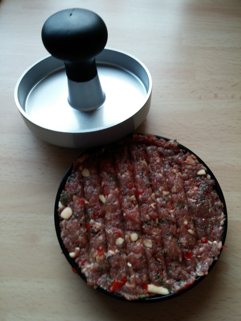Die Champignons und die Paprika kleinhacken und unter das Hackfleisch mischen. Das Gehackte mit Salz, Pfeffer und italienisches Kräutern würzen. Pro Patty (also Hamburgerfrikadelle) 125 g Gehacktes abnehmen und daraus einen flachen Patty formen. Wenn ihr das mit der Hand machen wollt, empfehle ich, in die fertige Frikadelle in die Mitte ein flaches Loch zu drücken – so wölbt sie sich beim Grillen nicht. Ich persönlich verwende ja äußerst gerne meine Hamburger Presse. Als späteren Belag die getrockneten Tomaten zu einer feinen Masse passieren.