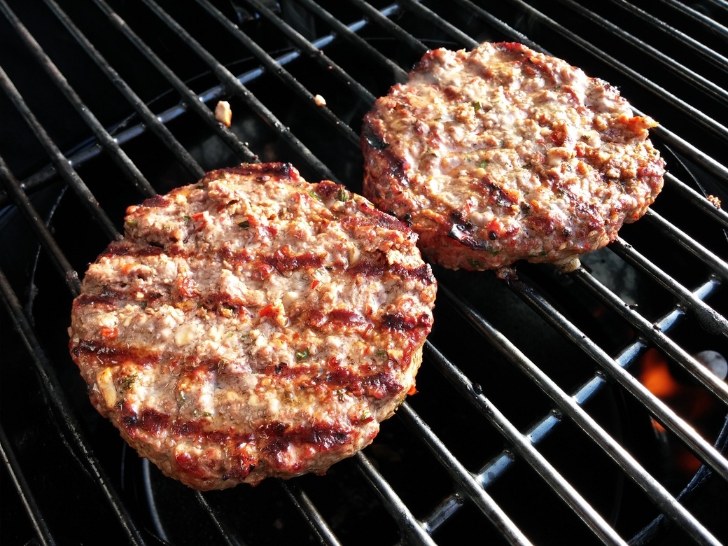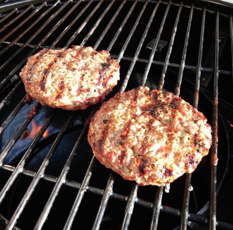 Zum Grillen den Grill auf direkte Hitze umstellen (d.h. den oberen Trichter meines Outdoorchefs Ascona in die Vulkanposition bringen) und ca. 10-15 Minuten vorheizen. Das Grillrost muss ordentlich heiß sein, damit sich ein schönes Branding einstellt und die Pattys sich später auch gut wenden lassen und nicht am Rost kleben bleiben. Die Pattys nun von jeder Seite ca. 4 Minuten grillen (gilt für ungefähr 2 cm dicke Pattys). Sie sollen von außen ein schönes Branding bekommen, aber innen noch medium und sehr saftig sein .