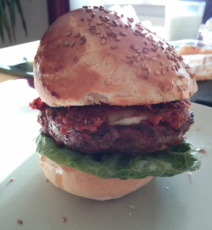 Die Buns ggf. aufwärmen (in unserem Fall nicht nötig, da gerade frisch gebacken) und mit Pesto bestreichen. Auf das Pesto folgt etwas Salat sowie die Frikadelle. Auf die Frikadelle die Paste aus getrockneten Tomaten auftragen, Hamburger zuklappen und genießen!