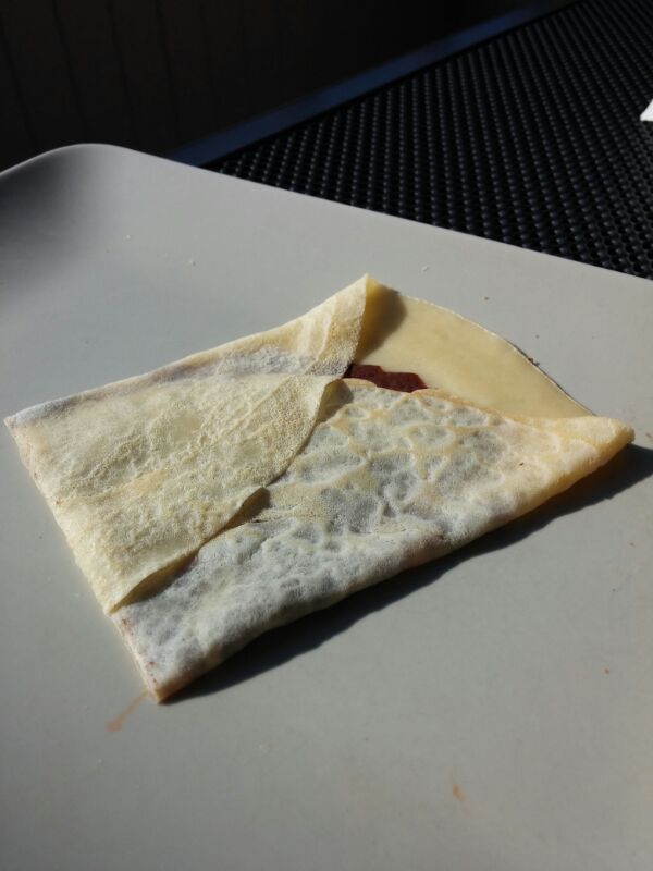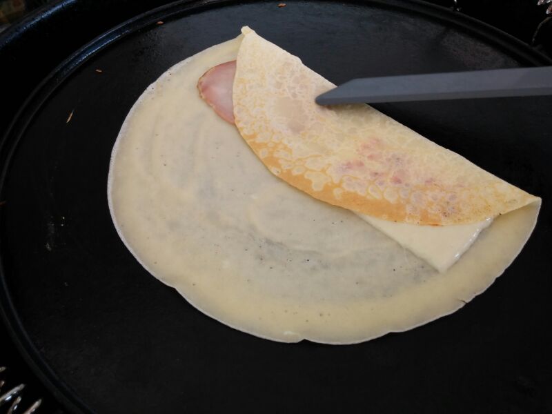 Für dieCrêpes vom Grill benötigte ich die glatte Seite der Plancha und nicht die geriffelte (die sich zum Beispiel für Steak eignet). Wichtig ist ordentliches Vorheizen, da das Gusseisen sich nur langsam erwärmt, aber dafür lange und gleichmäßig die Hitze hält. Der Grill ist dabei in Vulkanposition. Ich habe herausgefunden, dass die optimale Temperatur bei etwas weniger als halber Leistung erreicht ist. So wird der Crêpe nicht sofort schwarz und man kann den Teig ordentlich mit dem Teigschieber zu einem schönen Kreis ausformen. Nach kurzer Zeit habe ich dann die Zutaten wie den Käse auf den Teig gelegt, um ihn anschmelzen zu lassen. Nach wenigen Minuten habe ich dann den Crêpe gefaltet und serviert. Sie waren extrem lecker!
