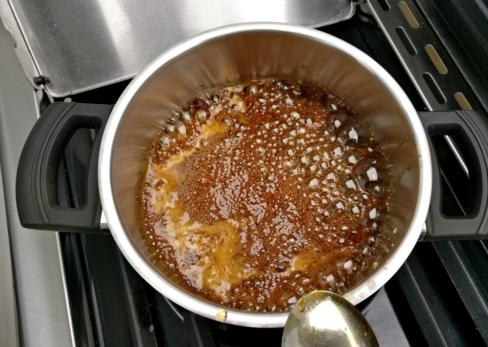 Ich beginne mit der Zubereitung der Glasur, mit der die Hähnchenspieße später bestrichen werden. Dazu gebe ich Honig, Sojasauce, geriebenen Ingwer und gepressten Knoblauch in einen kleinen Topf. Die Mischung koche ich auf dem Seitenbrenner meines Broil King Regal 490 für fünf Minuten auf. Danach kann die Glasur an die Seite gestellt werden.