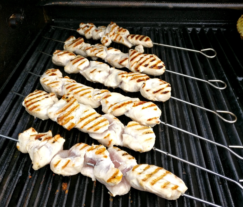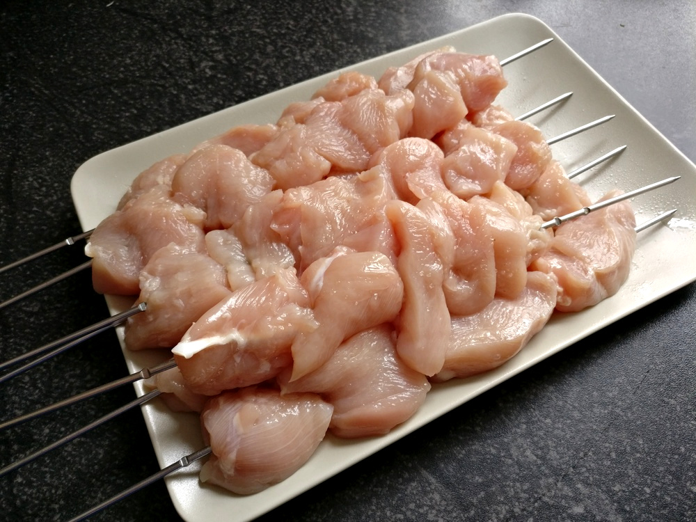 Während der Grill vorheizt, wasche ich die Hähnchenbrustfilets und schneide sie in circa ein Zentimeter dicke Streifen, die ich aufspieße und mit Öl-Trennspray besprühe und mit etwas Salz würze.