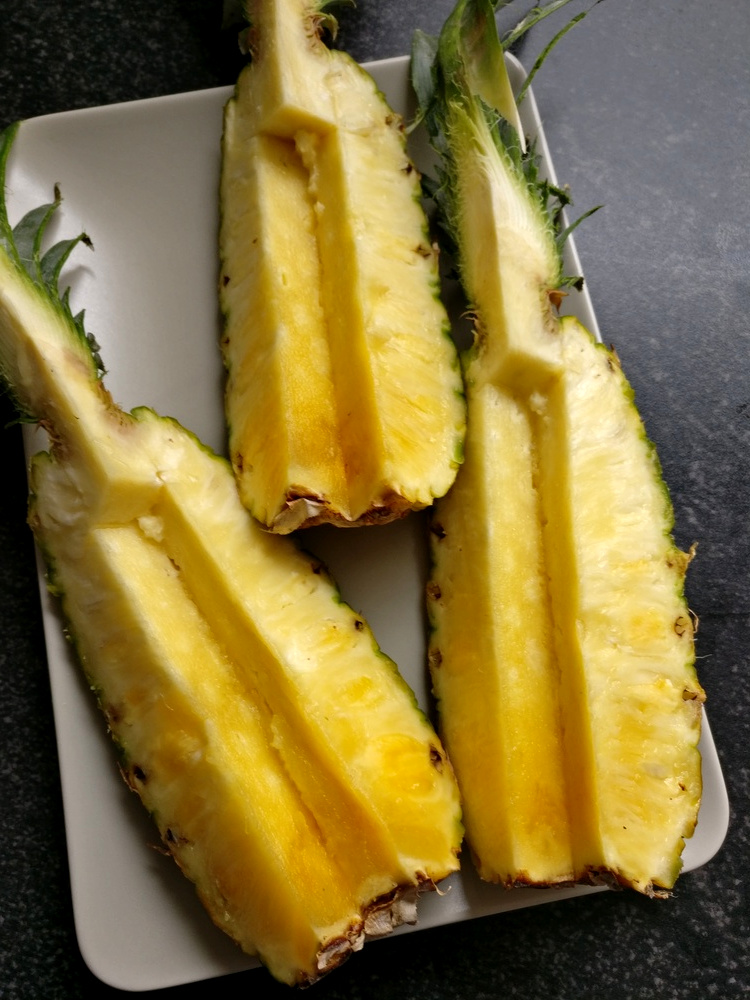 Weiter geht es mit der Ananas und dem Hähnchen. Da die Ananasviertel etwas länger gegrillt werden müssen, schneide ich zunächst die Ananas in Viertel und entferne den harten Strunk. Die Schnittflächen besprühe ich noch schnell mit etwas Trennspray, und dann sind die Ananasviertel bereit zum Grillen. Ein guter Zeitpunkt, um auch den Grill vorzuheizen.