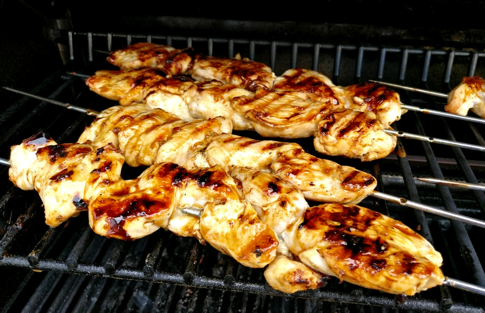Auf dem Warmhalterost grillen die Ingwer-Hähnchenspieße nun bei mittlerer indirekter Hitze für circa fünf Minuten zuende. Dann kann alles serviert werden. Die Spieße sehen schon köstlich und sehr saftig aus: