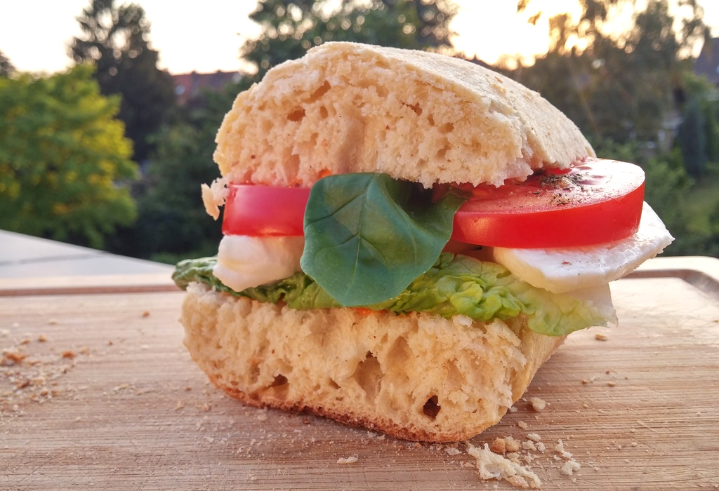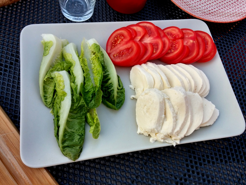 Während ich meinen Outdoorchef Ascona 570 G auf voller Hitze vorheize, wird in der Küche schon geschnibbelt: Tomaten und Romana Salatherz waschen, Mozzarella und Tomaten in Scheiben schneiden, Basilikumblätter abzupfen und alles auf einer Platte anrichten. Nun kommt das halbierte Ciabatta auf das Grillrost und wird indirekt bei halber Hitze für ca. 15 Minuten angeröstet. Und schon kann‘s mit dem Italian BBQ Quickie losgehen: