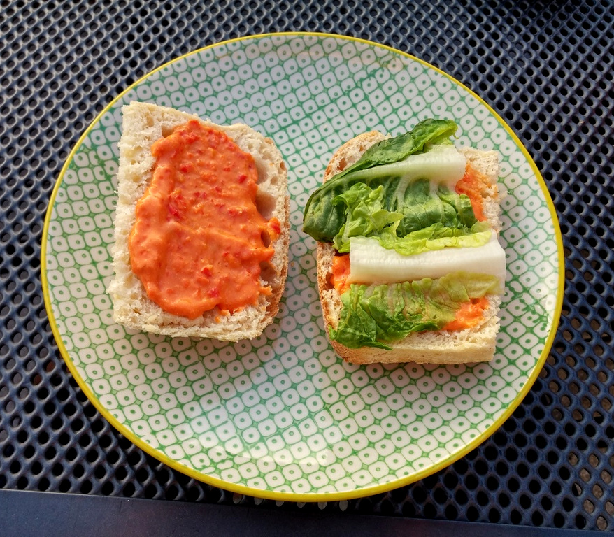 1 Ciabatta 1 Pesto Calabrese mit Peperoni 2 Tomaten 2 Mozzarella 1 Romana Salatherz 1 Basilikum im Topf 9-Pfeffer Symphonie von Ankerkraut
