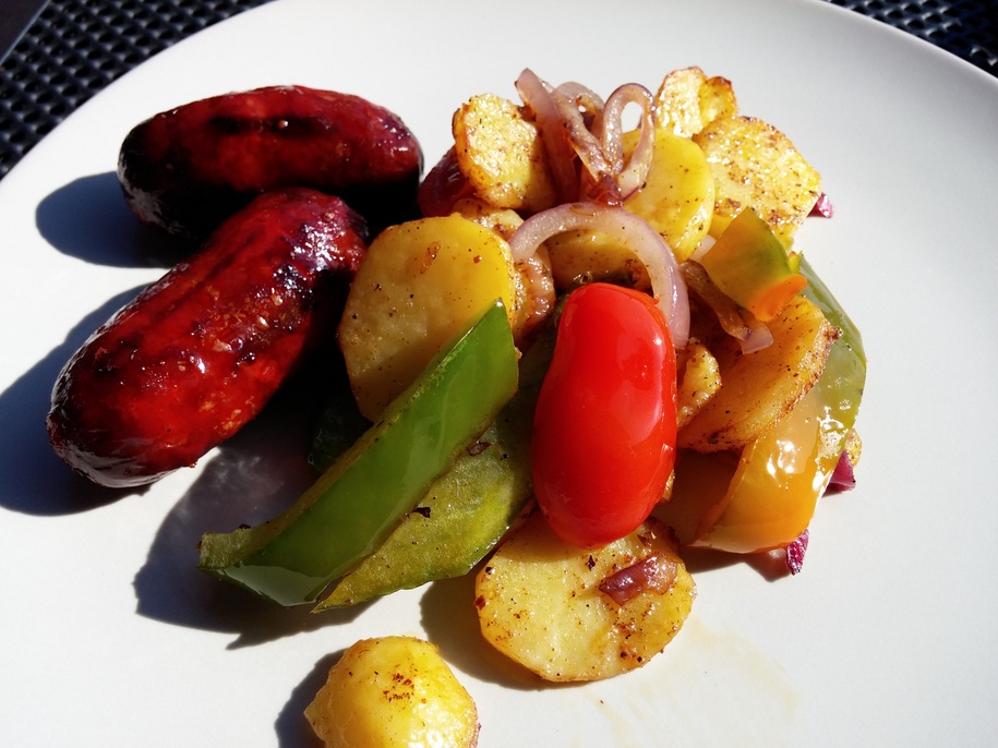 Nach 20 weiteren Minuten ist alles fertig, ich kann anrichten. Ich habe auch schon einen Riesenhunger! Gerade bei bestem Wetter und Sonnenschein sieht das Essen besonders gut aus. Ich finde es immer sehr schön, wenn das Essen auch kräftige Farben hat – die dunkelrote Chorizo, die gegrillten Kartoffeln, die grüne Paprika. Einfach schön. Aber schmeckt es auch?