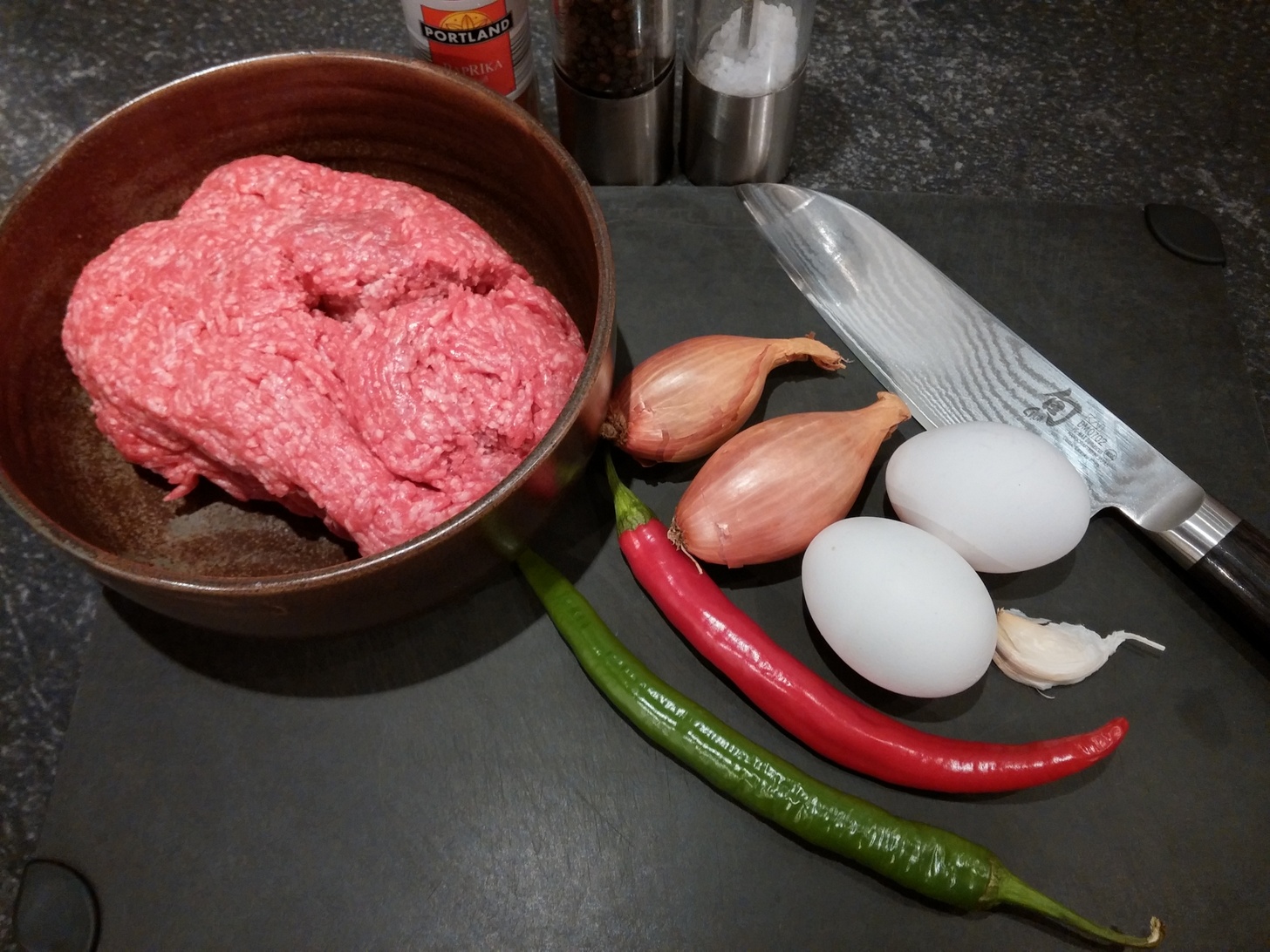 Für das Gehackte, für das ihr wahlweise Rinder- oder Lammgehacktes verwenden könnt, schneide ich zunächst zwei Schalotten in kleine Stücke. Außerdem hacke ich eine halbe grüne und eine halbe rote Chili klein. Damit das Gehackte ordentlich bindet, kommen nun noch zwei Eier dazu. Alles mit Pfeffer, Salz und etwas Paprika edelsüß würzen und gut vermengen.