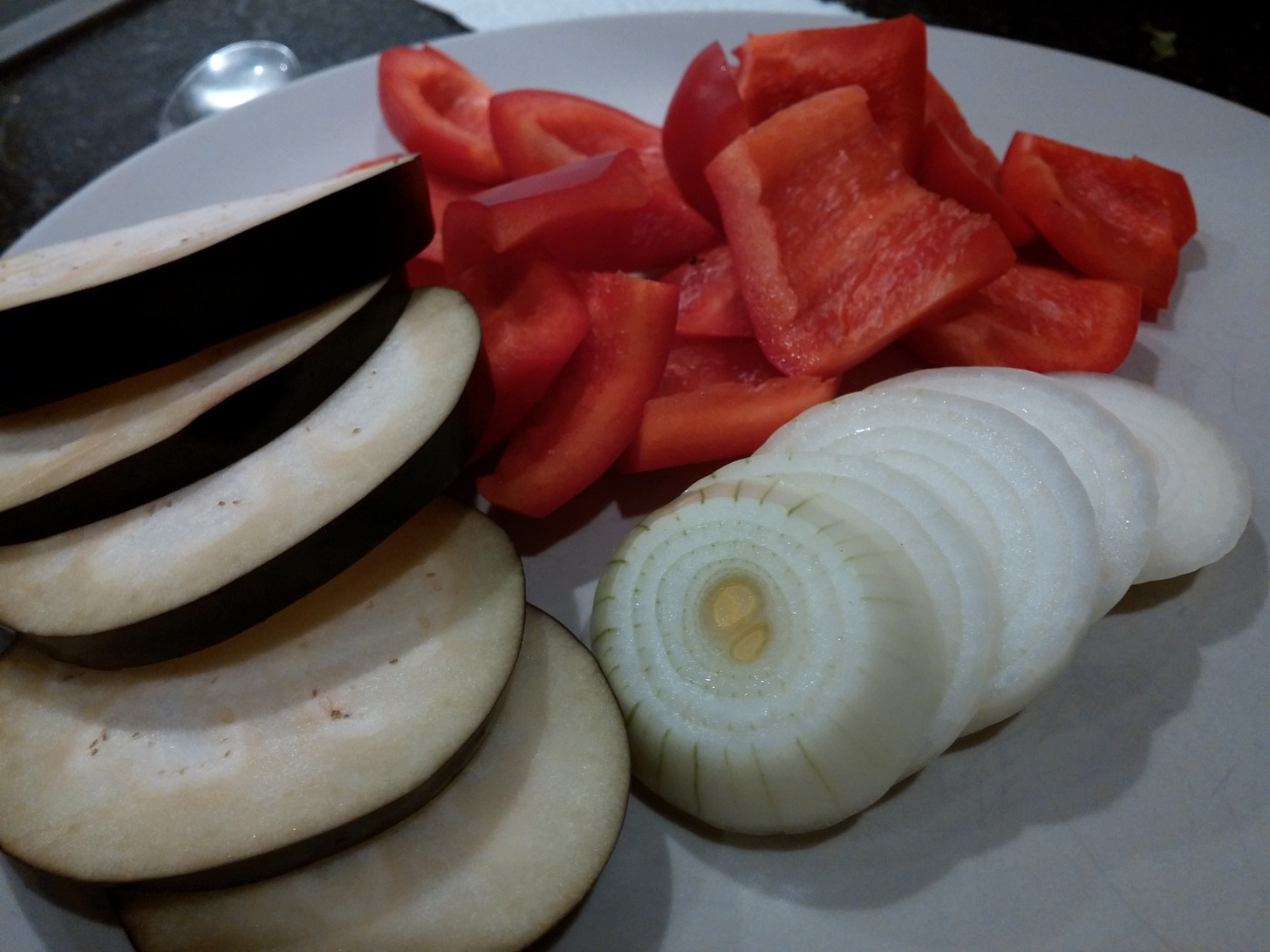 Für den Kebab-Burger braucht es außerdem noch Grillgemüse: Aubergine, Zwiebeln und Paprika. Die Aubergine und Zwiebel schneide ich dazu in ca. 0,5 cm dicke Scheiben, die Paprika in grobe Stückchen. Mit etwas Öl einreiben und leicht mit Pfeffer und Salz würzen.