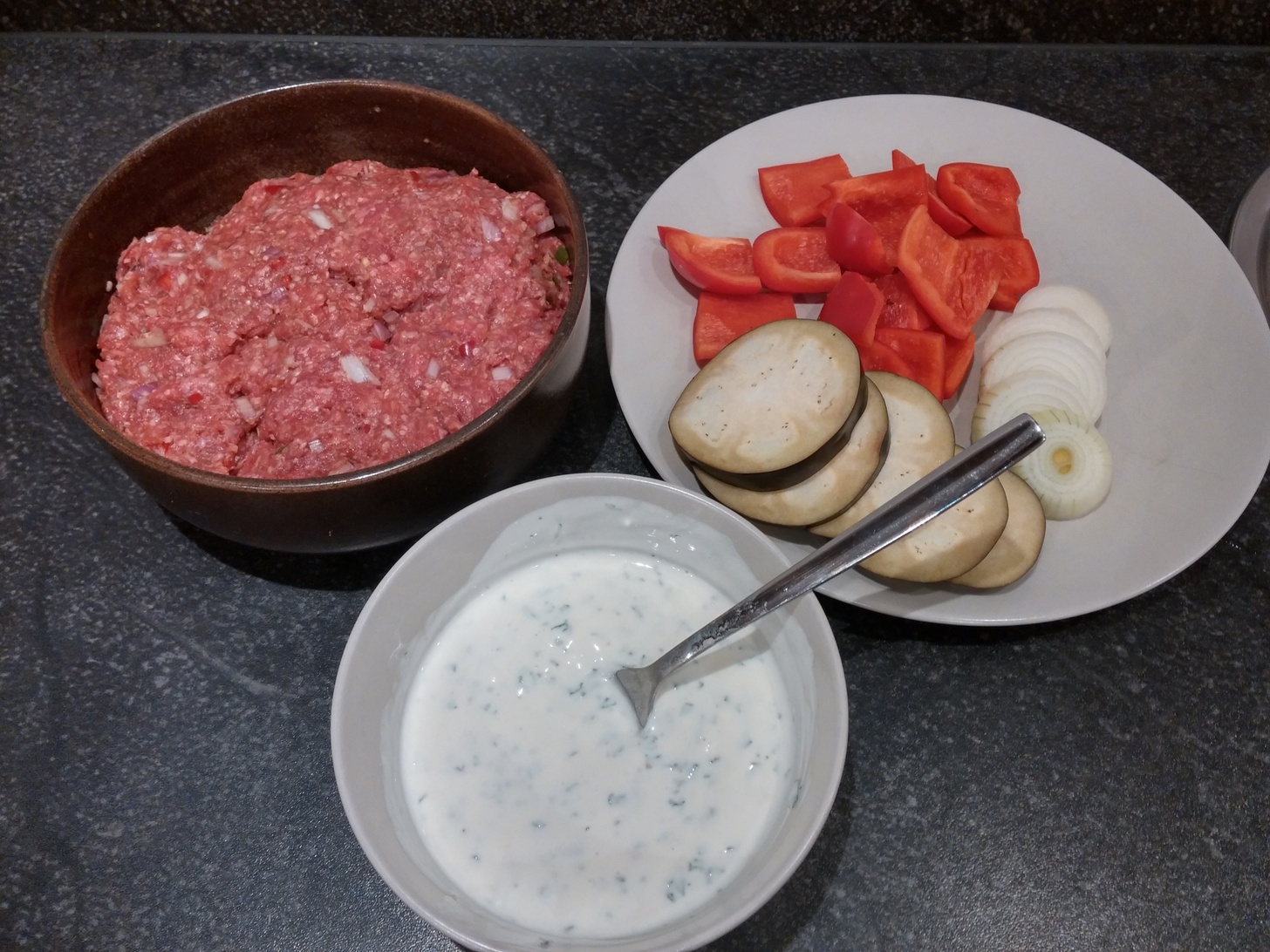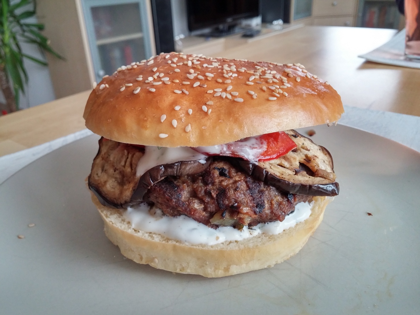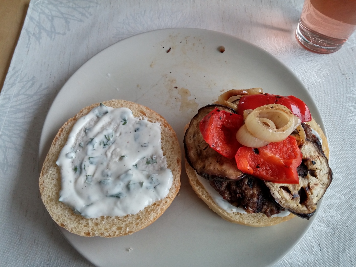 4 Hamburger Brötchen (Rezept findet ihr hier) 500 g Gehacktes vom Rind (oder Lamm) 4 Scharlotten 1/2 - 1 rote Chili 1/2 - 1 grüne Chili 1 Aubergine 1 rote Paprika Paniermehl Pfeffer Salz Paprika edelsüß 250 g Magerjoghurt 1/2 Becher Schmand 1 EL gehackte frische Minze 1/2 EL Zucker