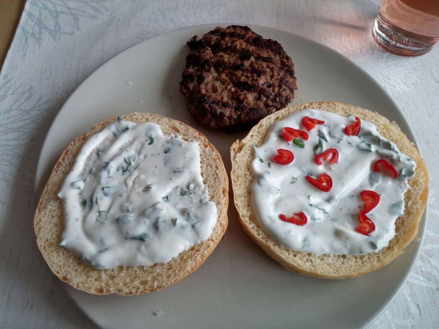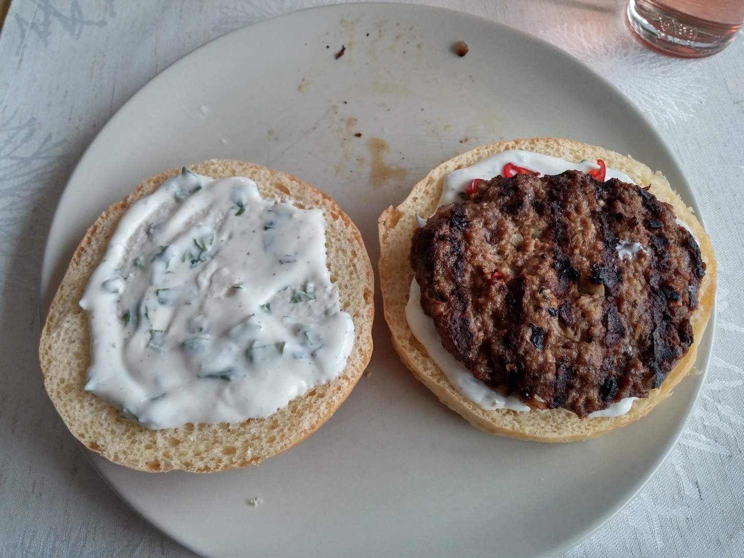 Beim Burger-Bauen sind der Phantasie keine Grenzen gesetzt. Etwas ist aber für mich fix: Auf beide Hälften des Hamburger Brötchens kommt zunächst die Grillsauce, die heute aus einer Minze-Joghurt-Schmand-Mischung besteht. Alles weitere ist dann variabel, zum Beispiel ob erst Fleisch oder erst Gemüse kommt.