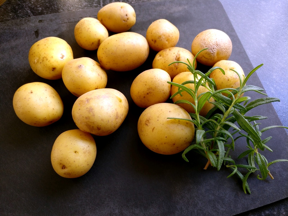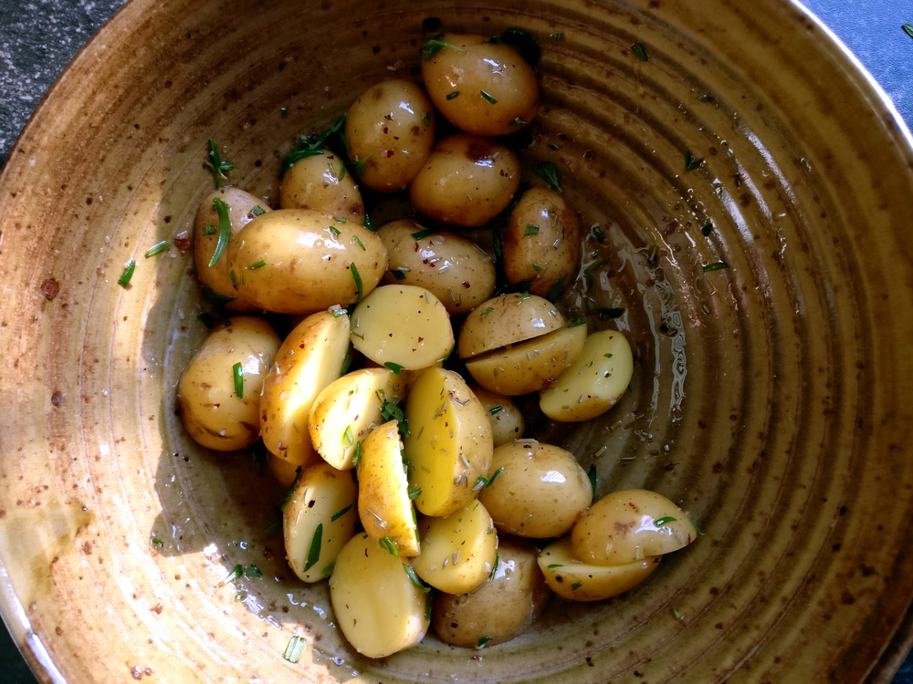 Dann beginne ich mit den Kartoffeln. Ich habe schöne Drillingskartoffeln erstanden, mit einer tollen Schale, die ich mitgrillen kann. Also reinige ich nur die Kartoffeln, halbiere sie und mariniere sie in einer Schale mit Olivenöl, Salz, Pfeffer und frischem Rosmarin. Von den Stangenbohnen entferne ich etwaige Spitzen sowie Enden.
