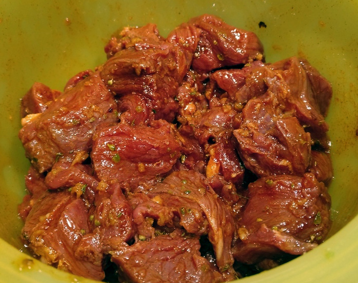 Die gute Qualität der Lammkeule eines Eifeler Ur Lamms zeigt sich bereits beim Schneiden, denn das Fleisch ist fein marmoriert und es tritt kaum Blut aus, da es eine Woche abgehangen wurde. Den Fettdeckel entferne ich und schneide dann das unter klarem Wasser abgespülte und abgetrocknete Fleisch in circa 3 cm dicke Stücke. In einer verschließbaren Schale mariniere ich dann das Lammfleisch mit zwei zerdrückten Knoblauchzehen sowie den restlichen Gewürzen.