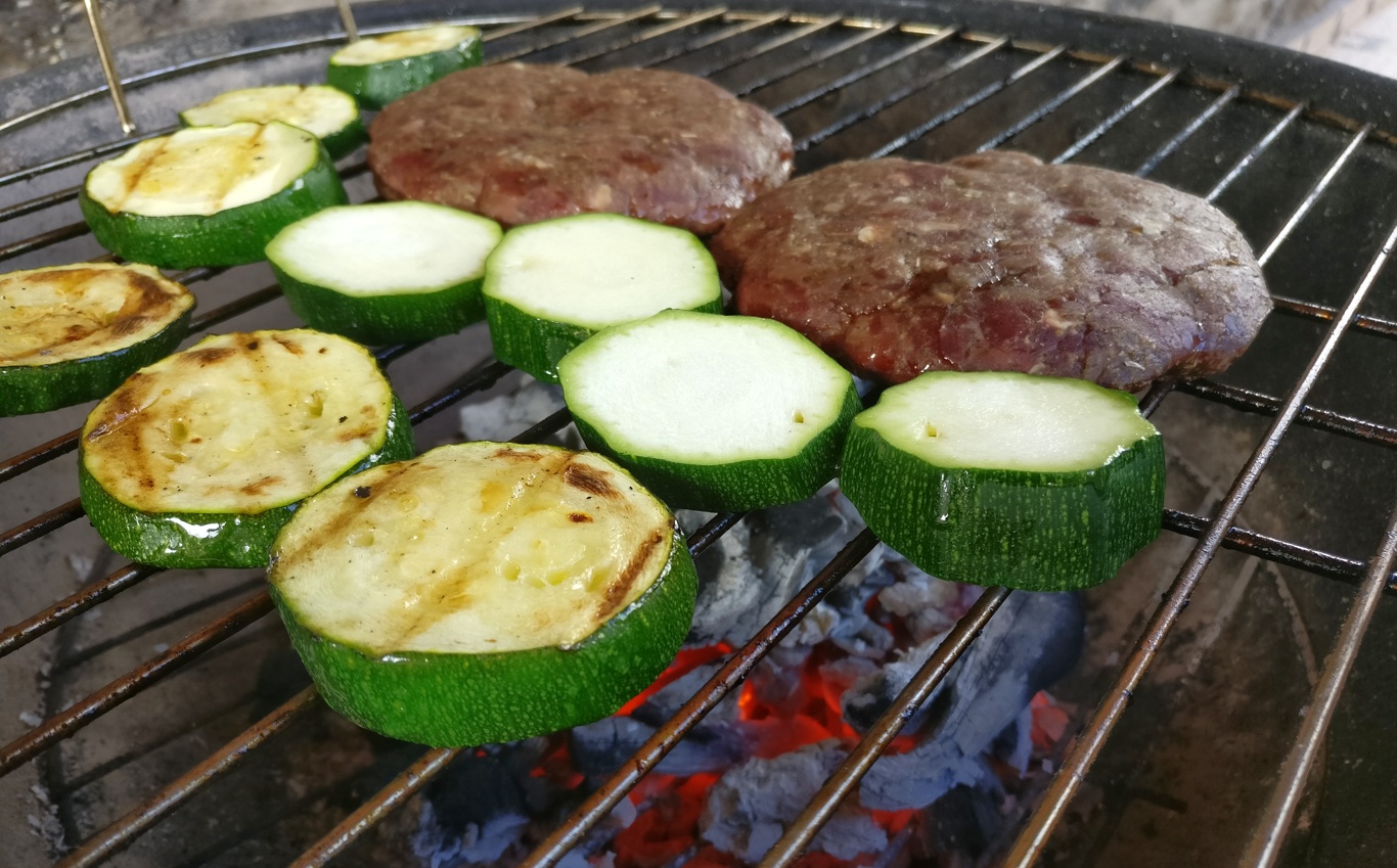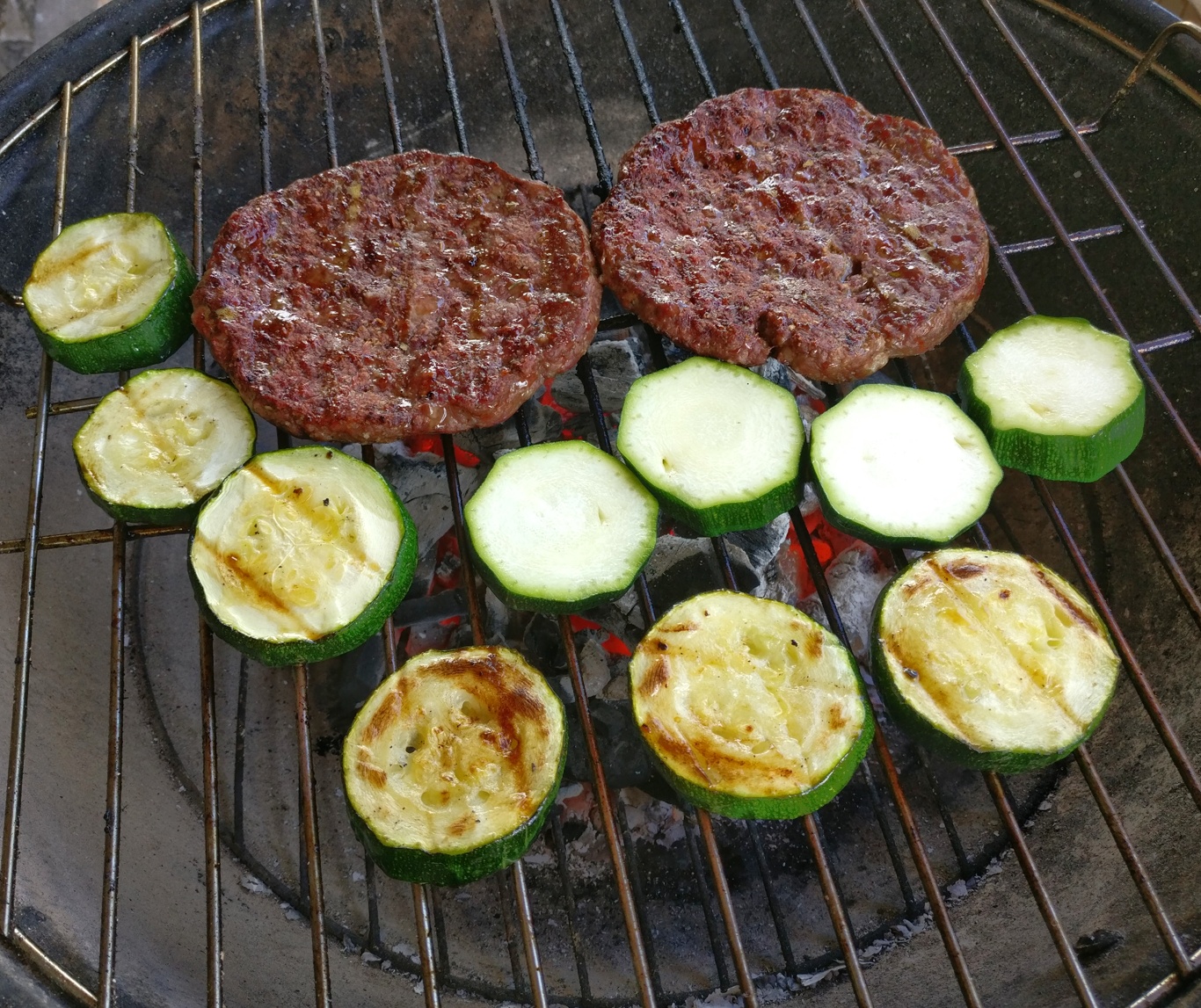 Dank des gereinigten Grills glüht die Kohle umso besser, da nun genügend Luft auch von unten in den Grill gelangt. Im Nu sind die Zucchini und Patties angegrillt.