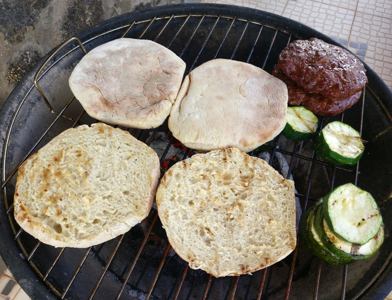 Meine beiden Hamburger Bolo do Caco waren dann recht schnell gegrillt und zubereitet. Einfach die beiden Patties und die Zucchinischeiben auf das heiße Grillrost legen und alles schön mit direkter Hitze angrillen.